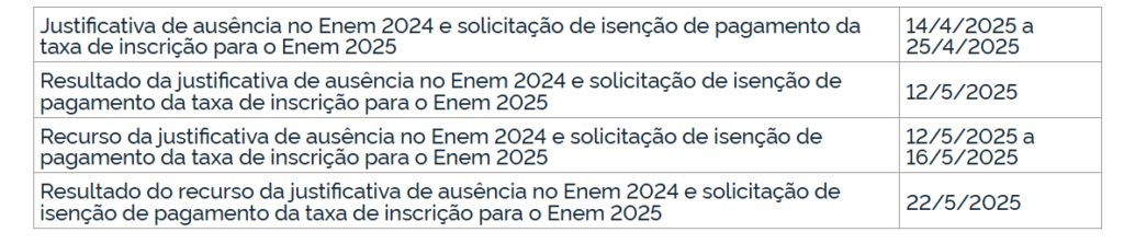 | Justificativa de ausência no Enem 2024 e solicitação de isenção de pagamento da taxa de inscrição | 14/04/2025 a 25/04/2025 |